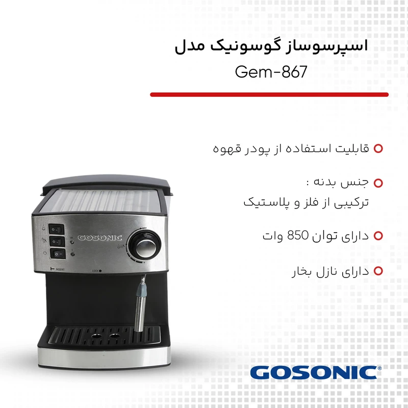 وزن اسپرسوساز گوسونیک مدل Gem-867در حدود 3.5 کیلوگرم است. پهنای این دستگاه 250 میلی‌متر ارتفاع آن 340 میلی‌متر و طول دستگاه 300 میلی‌متر خواهد بود. طول سیم این اسپرسوساز 1.5 متر است. فشار بخار در این دستگاه 15 بوده و توان 850 وات خواهد بود. جنس بدنه ترکیبی از فلز و پلاستیک است. این دستگاه دارای نشان‌گر سطح آب خواهد بود. از قابلیت‌های این اسپرسوساز می‌توان به تنظیم میزان غلظت قهوه، قابلیت استفاده از پودر قهوه، امکان تهیه کف خامه‌ای جهت کاپوچینو و قابلیت درست کردن هم زمان دو فنجان نوشیدنی اشاره کرد. این اسپرسوساز از نظر ویژگی‌های نظافتی فیلتر آب دارد. نوشیدنی‌های قابل تهیه با این اسپرسوساز اسپرسو، کافه لاته و کاپوچینو هستند. از دیگر امکانات اسپرسوساز داشتن نازل بخار اشاره کرد. حجم مخزن آب 1.6 و ظرفیت مخزن آن 1.6 خواهدبود.