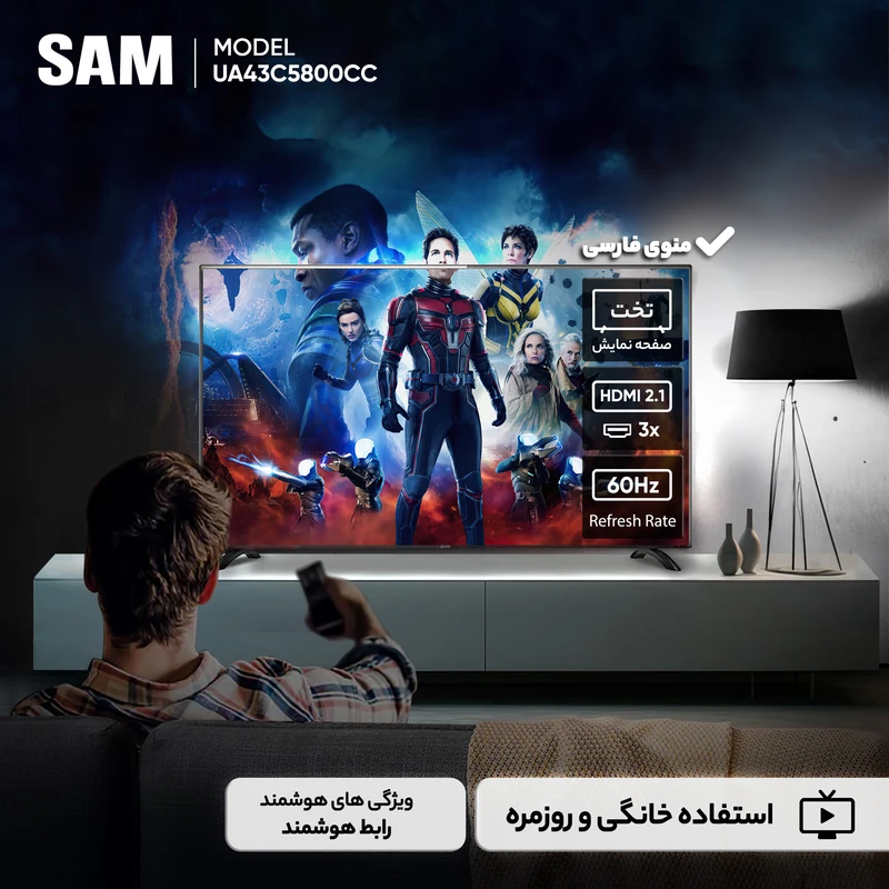 تلویزیون ال ای دی هوشمند سام الکترونیک مدل UA43C5800CC با سایز 43 اینچ به شما امکان نمایش تصاویر با کیفیت و رزولوشن بالا را برای تماشای برنامه‌های تلویزیونی ارائه می‌دهد. این تلویزیون با قابلیت هوشمند سازی، امکان دسترسی به برنامه‌های اینترنتی، موزیک و ویدیوها را فراهم می‌کند. تلویزیون UA43C5800CC با پشتیبانی از HDR، عمق رنگ‌های تصاویر را بیشتر کرده است. تلویزیون UA43C5800CC دارای پردازشگر قوی و رابط کاربری ساده و کاربرپسند بوده و با تکنولوژی وای‌فای، به شما امکان دسترسی به اینترنت و مرورگر وب را فراهم می‌کند. این تلویزیون با طراحی باریک و زیبا به راحتی در هر محیطی جای می‌گیرد و با پایه قابل تنظیم، می‌توانید محل نصب آن را به دلخواه خود تغییر دهید. این تلویزیون از شبکه های HD صداوسیما پشتیبانی می‌کند.